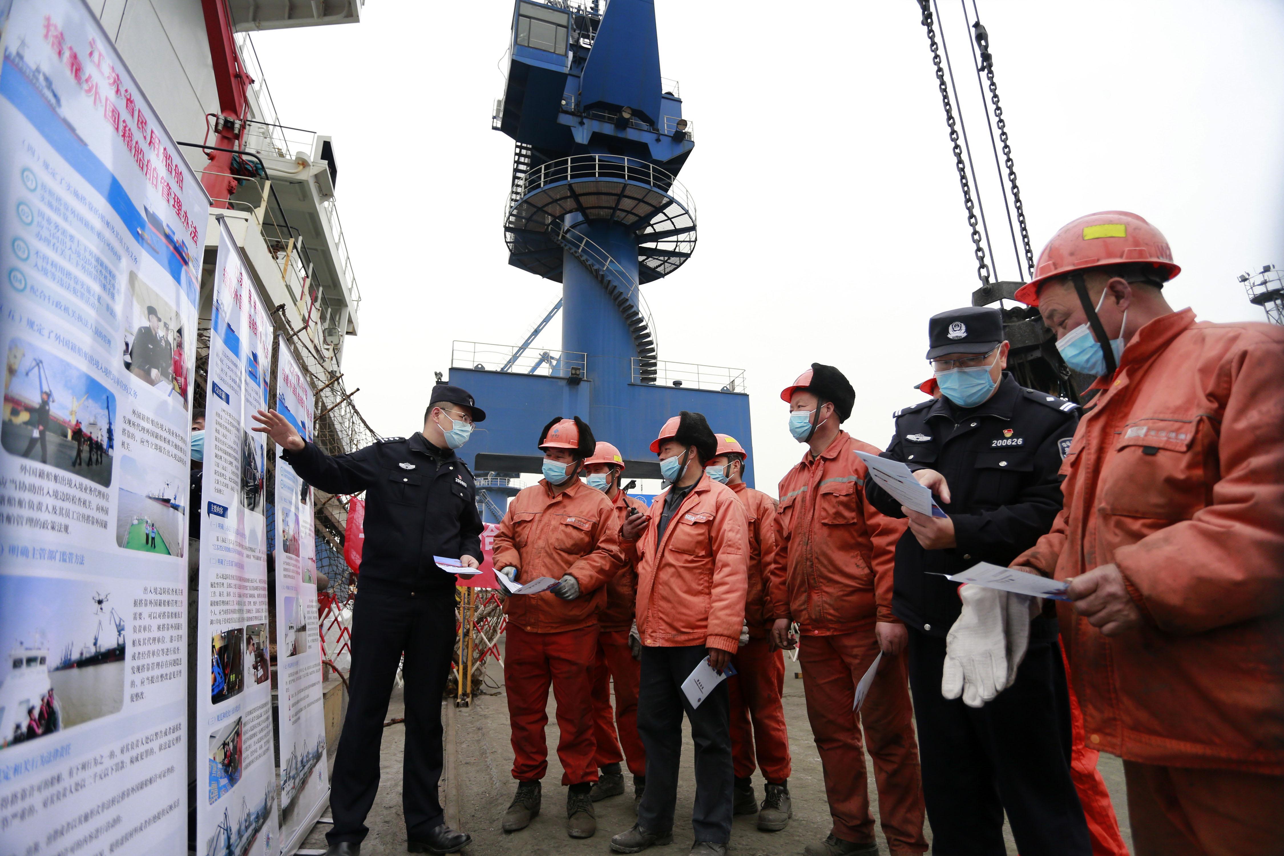 《江蘇省民用船舶搭靠外國籍船舶管理辦法》將于4月1日起施行。2月23日,江蘇南京港出入境邊防檢查站組織普法小分隊(duì)深入港口船企和碼頭,開展普法宣傳活動(dòng)。圖為普法小分隊(duì)成員向碼頭工人普及新規(guī)。 本報(bào)通訊員 張光偉 章善玉 攝