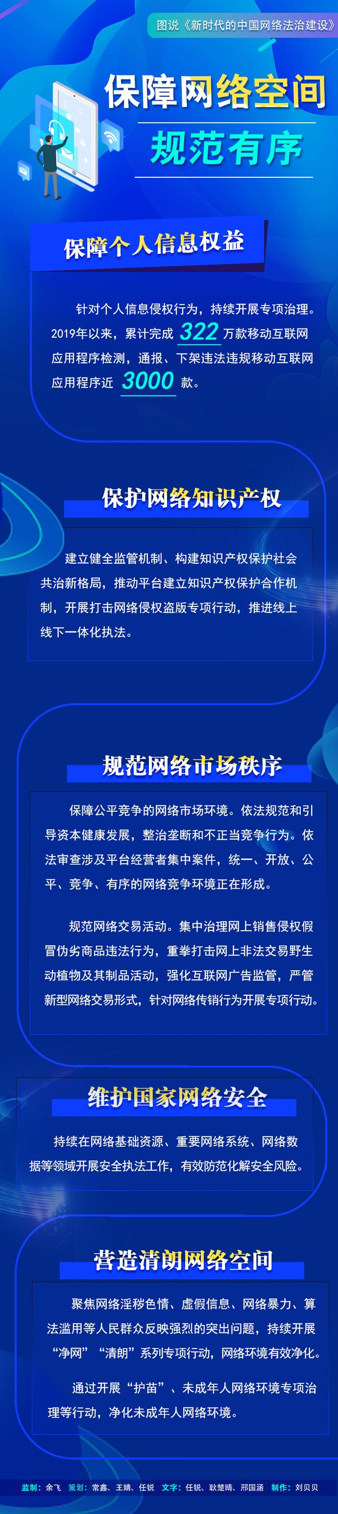 互聯(lián)網(wǎng)是人類文明發(fā)展的重要成果,法治是互聯(lián)網(wǎng)治理的基本方式。長(zhǎng)期以來(lái),我國(guó)堅(jiān)持依法治網(wǎng),持續(xù)推進(jìn)網(wǎng)絡(luò)空間法治化,推動(dòng)互聯(lián)網(wǎng)在法治軌道上健康運(yùn)行。3月16日,國(guó)務(wù)院新聞辦公室發(fā)布《新時(shí)代的中國(guó)網(wǎng)絡(luò)法治建設(shè)》白皮書(shū),讓我們一起來(lái)看中國(guó)健康規(guī)范的網(wǎng)絡(luò)空間秩序。