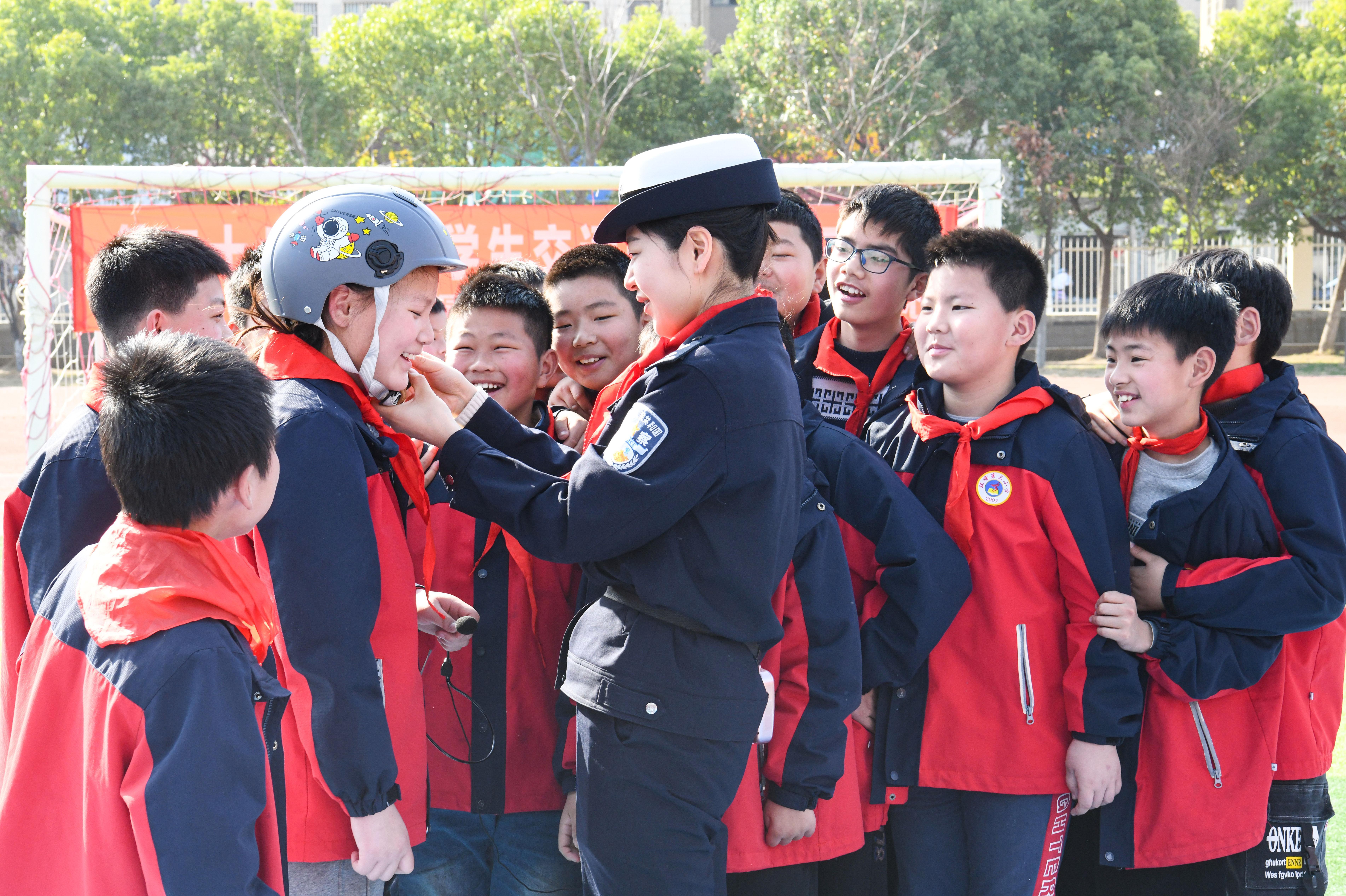 3月27日,安徽省含山縣公安局交管大隊(duì)組織民警走進(jìn)環(huán)峰第三小學(xué)開(kāi)展以“大手拉小手 一起學(xué)交安”為主題的宣傳教育活動(dòng)。民警根據(jù)現(xiàn)實(shí)生活中常見(jiàn)的一些交通違法行為,制作“交通安全游戲棋”,通過(guò)情景表演等形式,讓孩子們?cè)谠⒔逃跇?lè)中學(xué)習(xí)交通安全知識(shí)。圖為民警向?qū)W生講解安全頭盔的重要性。 本報(bào)通訊員 馮善軍 攝