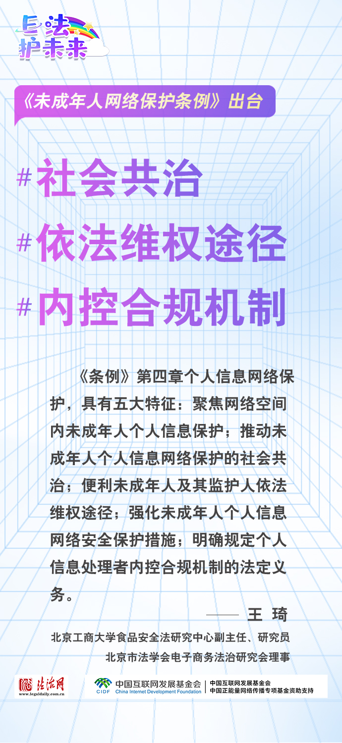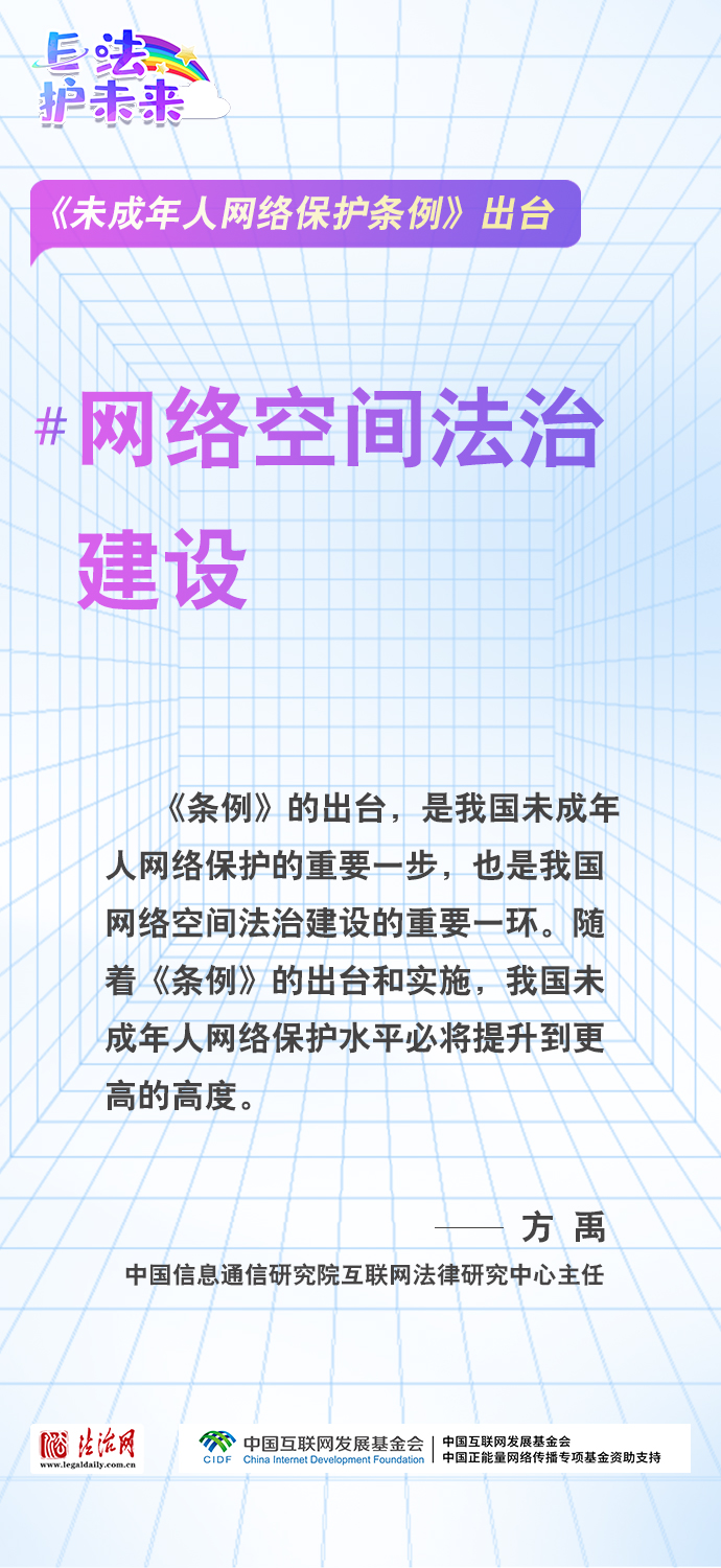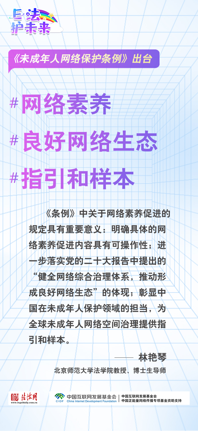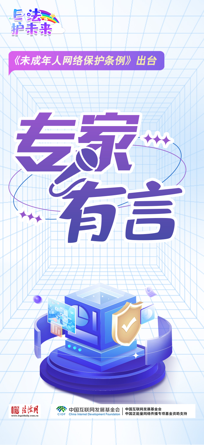 法治網(wǎng)特推出一組“專(zhuān)家有言”海報(bào),內(nèi)容涵蓋《條例》出臺(tái)的現(xiàn)實(shí)意義和時(shí)代價(jià)值、網(wǎng)絡(luò)素養(yǎng)促進(jìn)、網(wǎng)絡(luò)信息內(nèi)容規(guī)范、個(gè)人信息網(wǎng)絡(luò)保護(hù)、網(wǎng)絡(luò)沉迷防治等,充分展現(xiàn)《條例》的出臺(tái)是我國(guó)互聯(lián)網(wǎng)治理領(lǐng)域的法治成果,彰顯中國(guó)在未成年人網(wǎng)絡(luò)保護(hù)領(lǐng)域的擔(dān)當(dāng),為全球未成年人網(wǎng)絡(luò)空間治理提供指引和樣本。