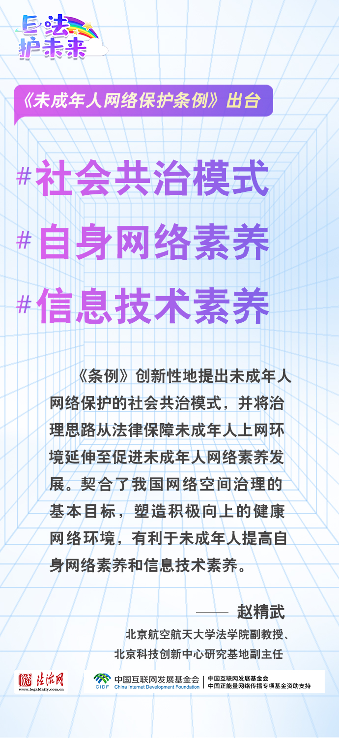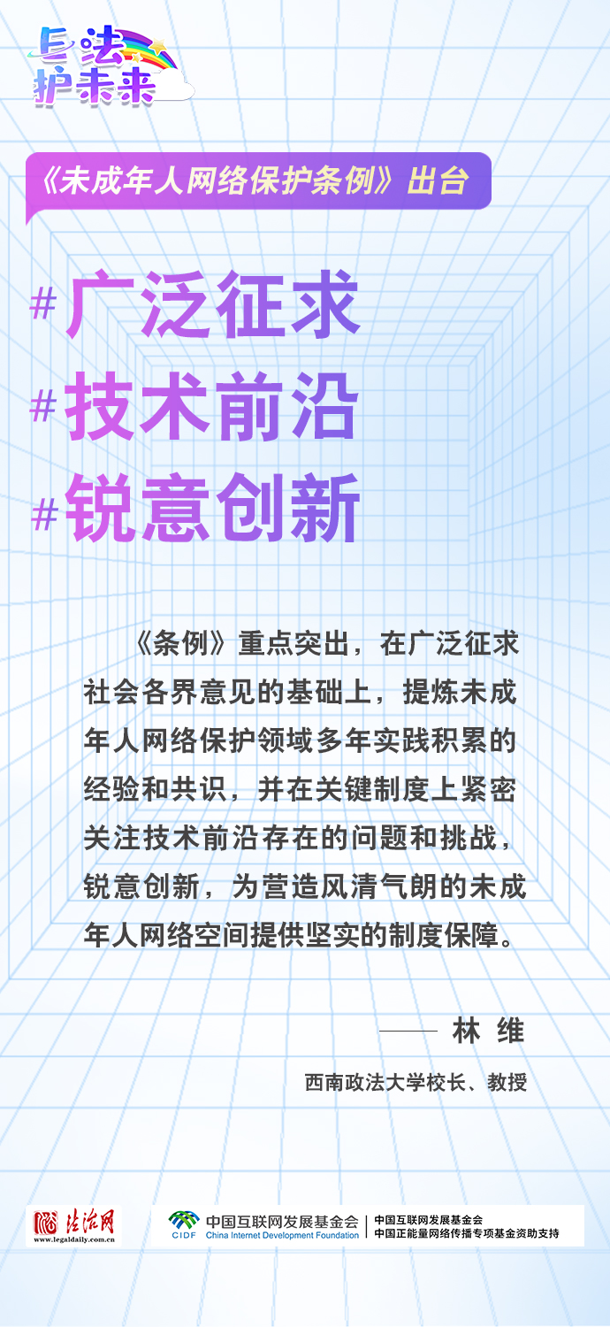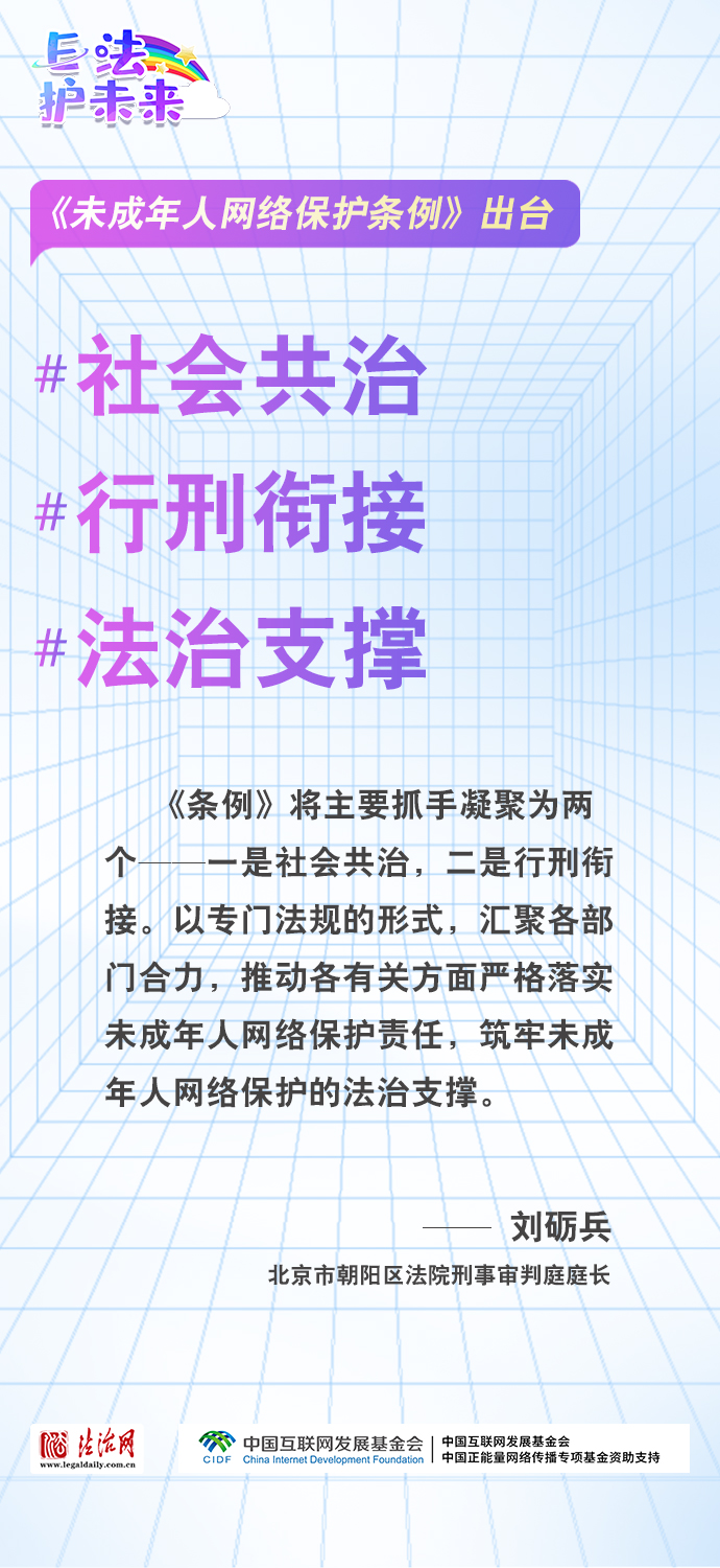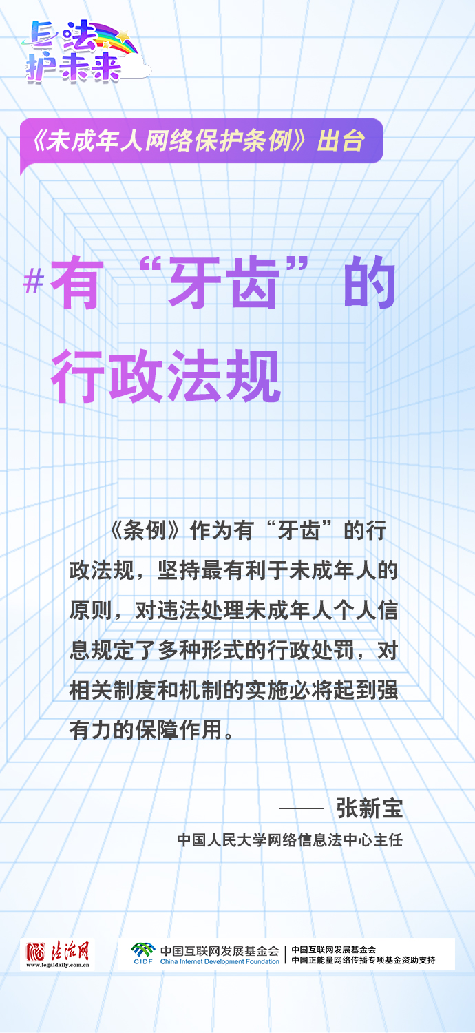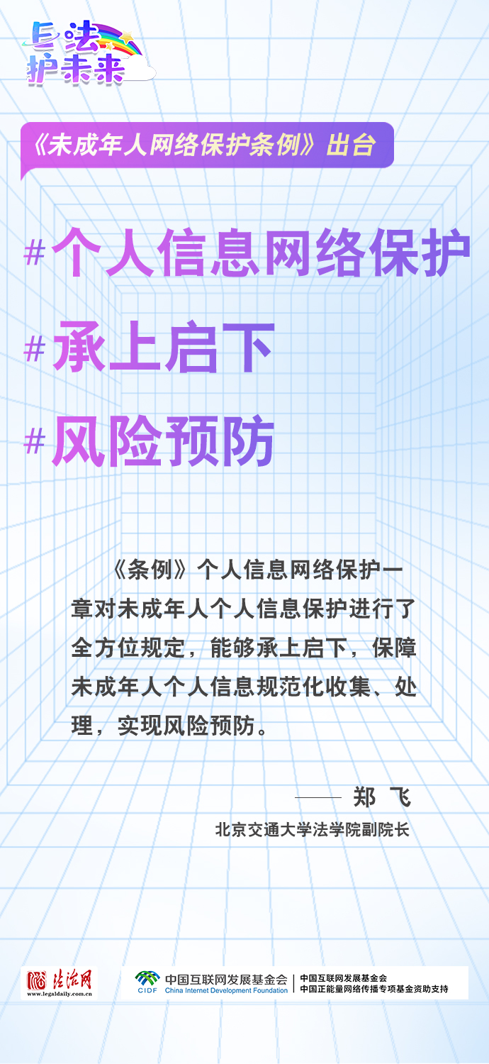 法治網(wǎng)特推出一組“專(zhuān)家有言”海報(bào),內(nèi)容涵蓋《條例》出臺(tái)的現(xiàn)實(shí)意義和時(shí)代價(jià)值、網(wǎng)絡(luò)素養(yǎng)促進(jìn)、網(wǎng)絡(luò)信息內(nèi)容規(guī)范、個(gè)人信息網(wǎng)絡(luò)保護(hù)、網(wǎng)絡(luò)沉迷防治等,充分展現(xiàn)《條例》的出臺(tái)是我國(guó)互聯(lián)網(wǎng)治理領(lǐng)域的法治成果,彰顯中國(guó)在未成年人網(wǎng)絡(luò)保護(hù)領(lǐng)域的擔(dān)當(dāng),為全球未成年人網(wǎng)絡(luò)空間治理提供指引和樣本。