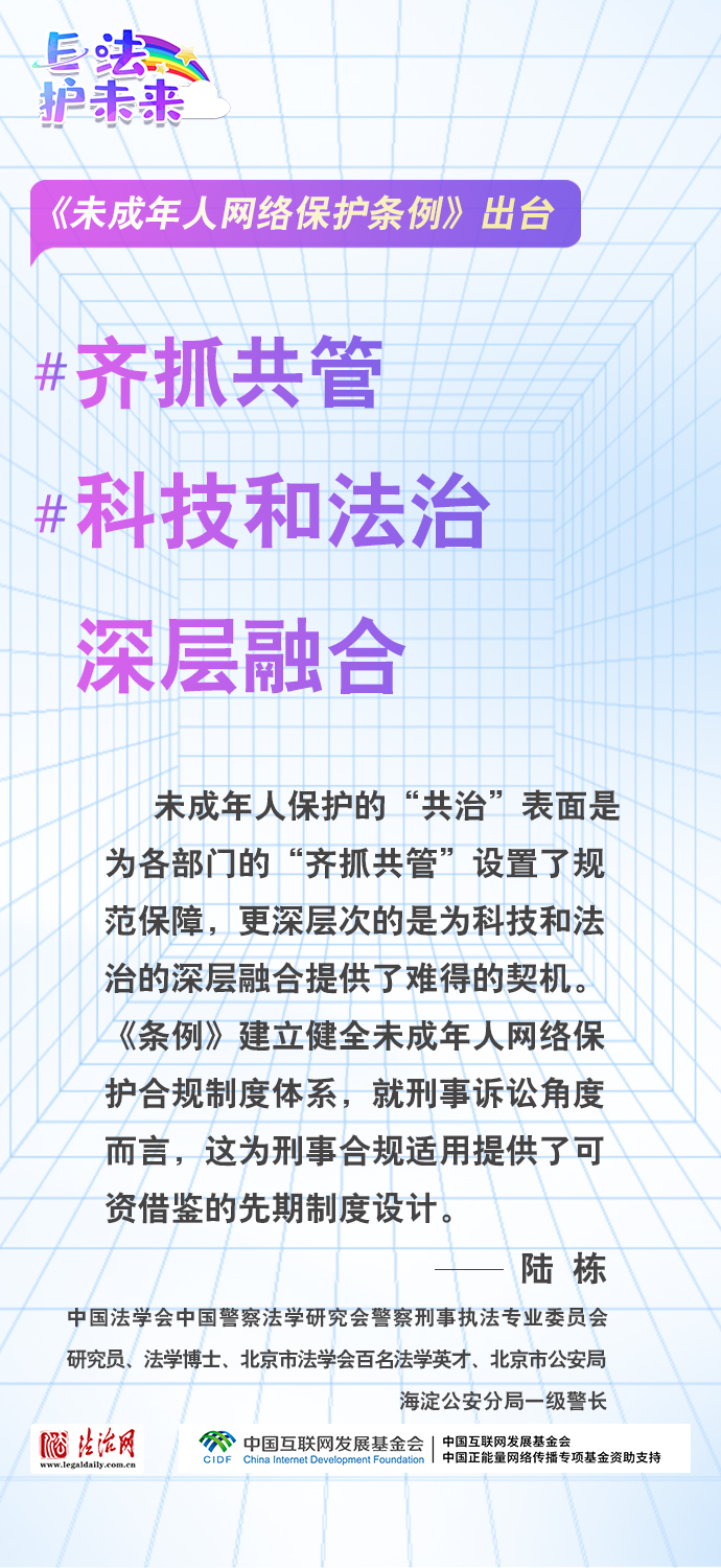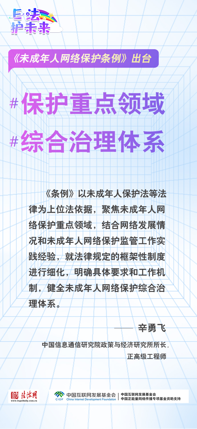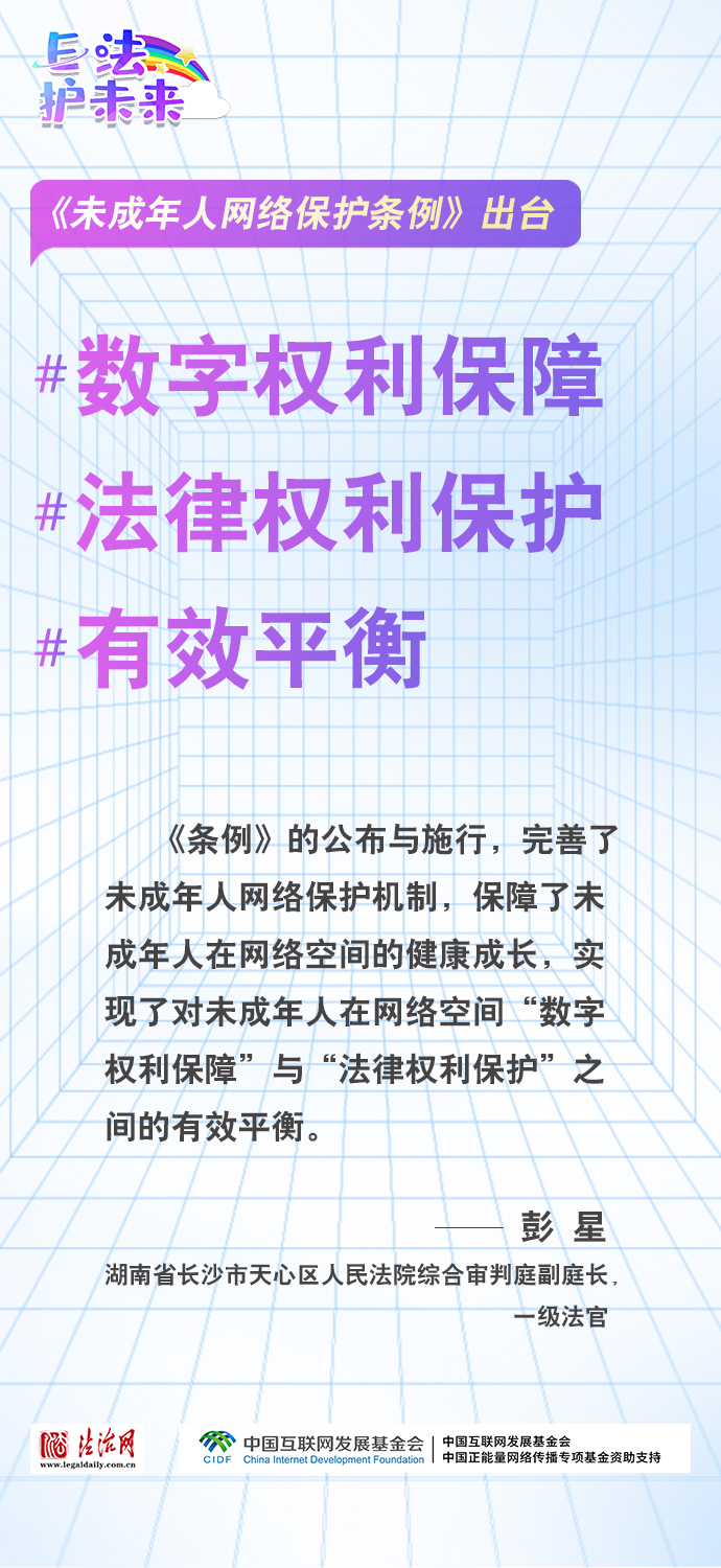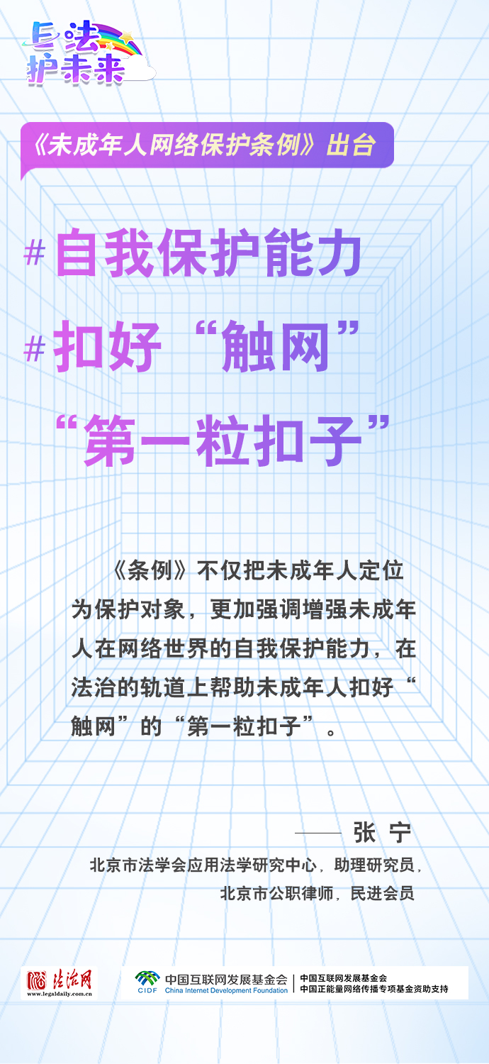 法治網(wǎng)特推出一組“專(zhuān)家有言”海報(bào),內(nèi)容涵蓋《條例》出臺(tái)的現(xiàn)實(shí)意義和時(shí)代價(jià)值、網(wǎng)絡(luò)素養(yǎng)促進(jìn)、網(wǎng)絡(luò)信息內(nèi)容規(guī)范、個(gè)人信息網(wǎng)絡(luò)保護(hù)、網(wǎng)絡(luò)沉迷防治等,充分展現(xiàn)《條例》的出臺(tái)是我國(guó)互聯(lián)網(wǎng)治理領(lǐng)域的法治成果,彰顯中國(guó)在未成年人網(wǎng)絡(luò)保護(hù)領(lǐng)域的擔(dān)當(dāng),為全球未成年人網(wǎng)絡(luò)空間治理提供指引和樣本。