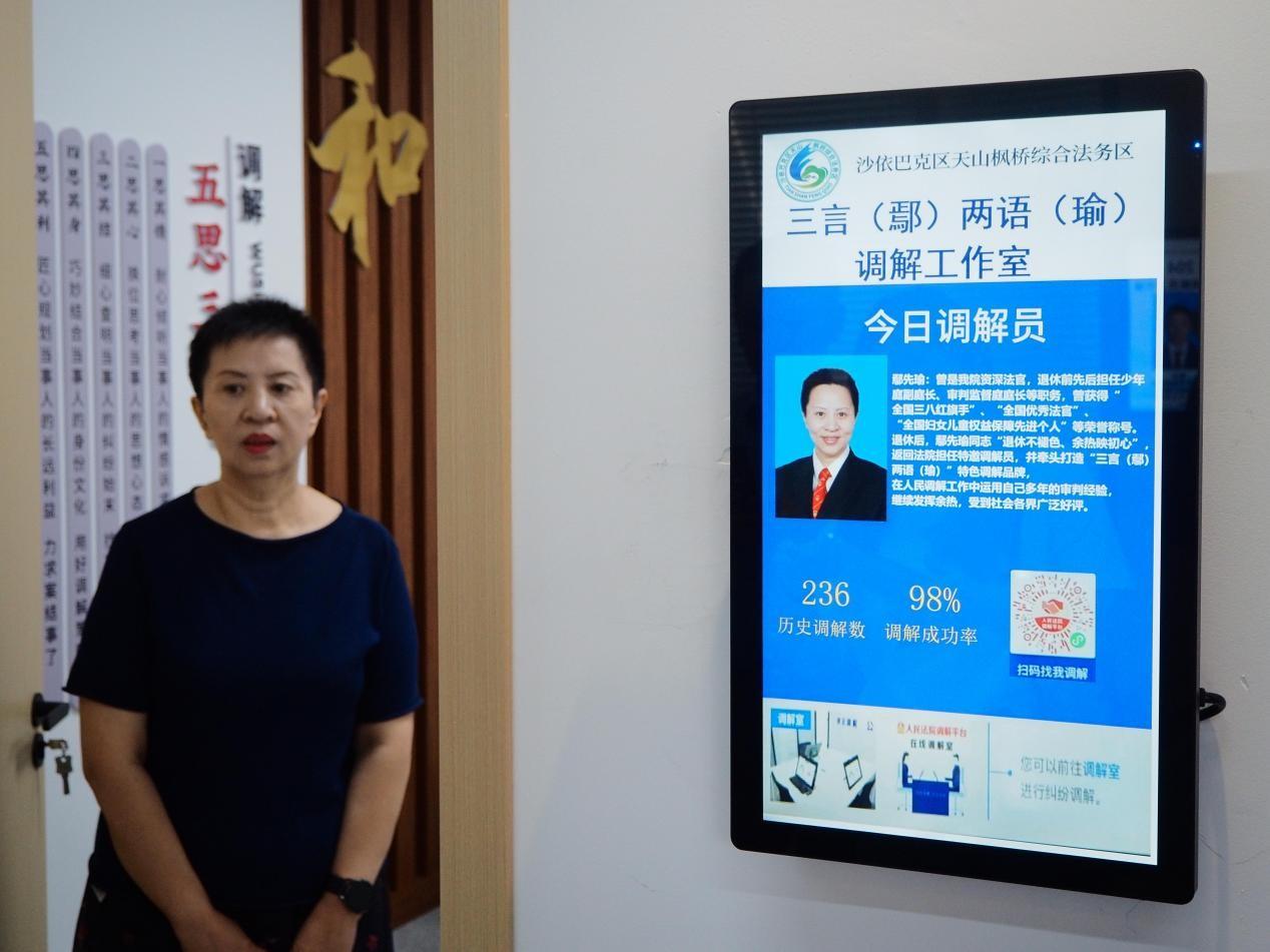 在新疆烏魯木齊市沙依巴克區(qū)“天山楓橋”綜合法務(wù)區(qū),有一個(gè)“三言(鄢)兩語(瑜)調(diào)解工作室”,鄢先瑜就在這里,完成了數(shù)百件婚姻家事案件的訴前調(diào)解。
