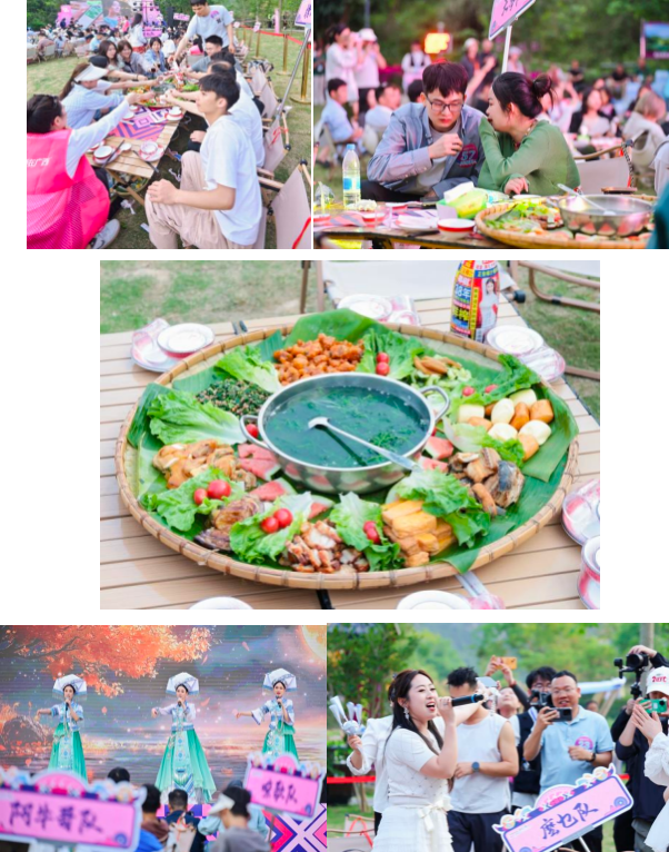春風(fēng)沉醉的夜晚,“村晚”音樂會(huì)暨長桌簸箕宴溫馨開啟。嘉賓們圍坐一堂,共享以自制五色糯米飯為核心的廣西特色美食,在輕柔的音樂中暢談交流。樂隊(duì)登臺演繹青春浪漫經(jīng)典曲目,點(diǎn)燃現(xiàn)場氛圍。
