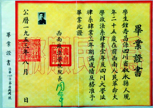 西南政法學院第一張畢業(yè)證。