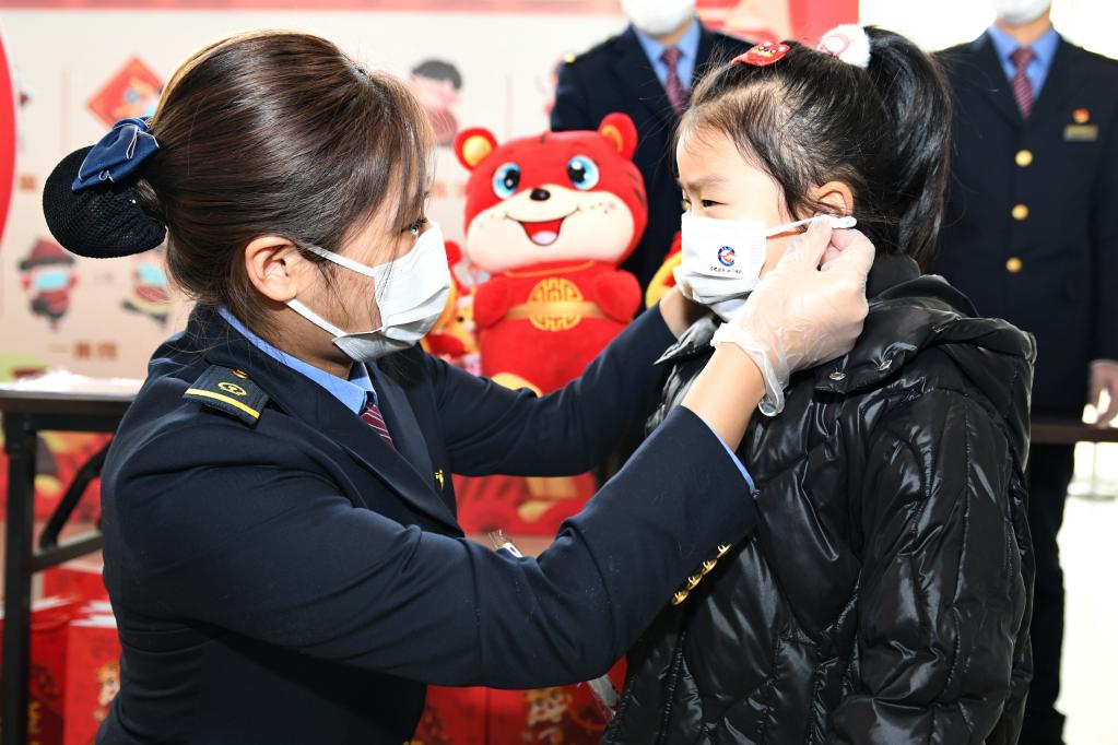 1月16日,在常州站候車室防疫宣傳活動(dòng)現(xiàn)場,鐵路工作人員為候車小朋友戴好口罩。新華社發(fā)(史康 攝)