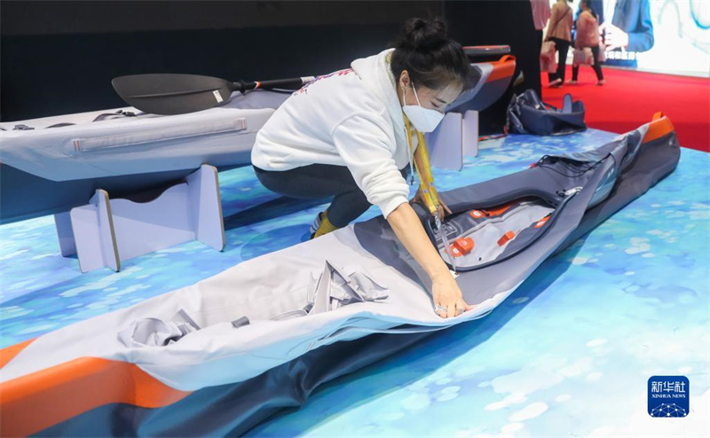 工作人員在第三屆中國(guó)國(guó)際進(jìn)口博覽會(huì)消費(fèi)品展區(qū)的迪卡儂展臺(tái)演示可折疊皮劃艇如何安裝(2020年11月6日攝)。新華社記者 丁汀 攝