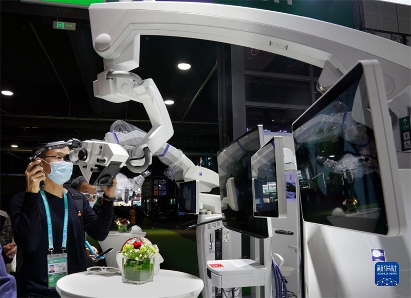 在第三屆中國(guó)國(guó)際進(jìn)口博覽會(huì)醫(yī)療器械及醫(yī)藥保健展區(qū)蔡司集團(tuán)展臺(tái),參觀者體驗(yàn)手術(shù)顯微鏡(2020年11月6日攝)。新華社記者 劉穎 攝