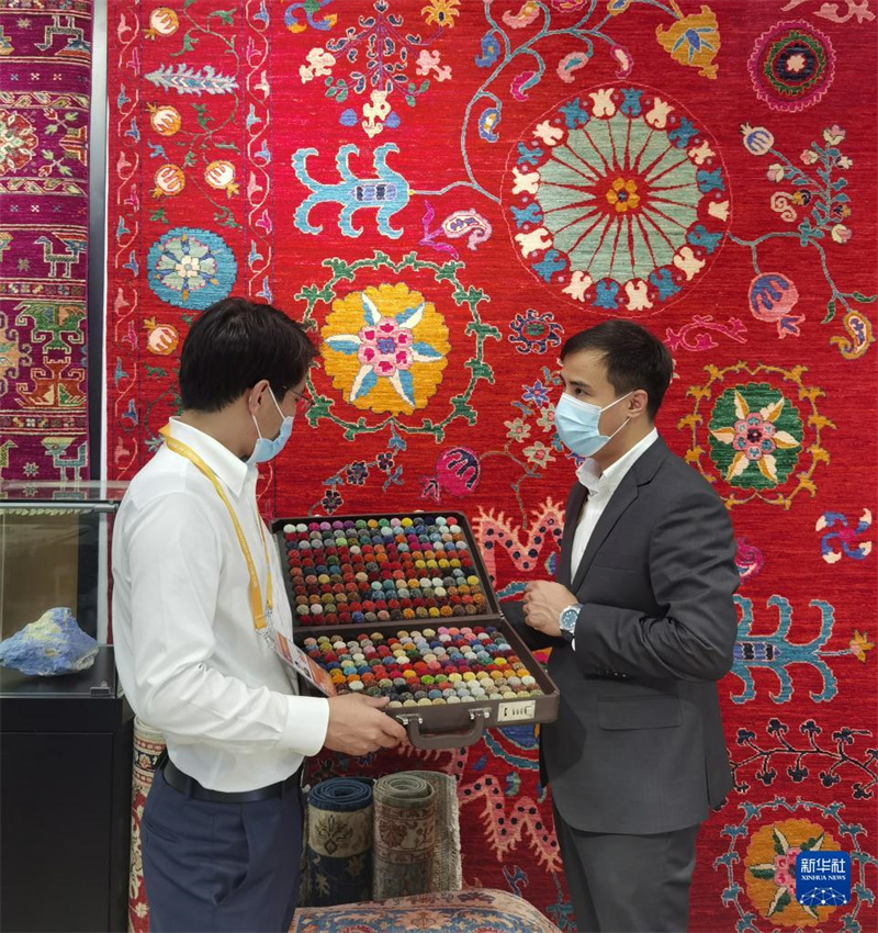阿富汗參展商阿里·法伊茲(右)在第四屆中國(guó)國(guó)際進(jìn)口博覽會(huì)阿富汗手工羊毛地毯展臺(tái)忙碌(2021年11月5日攝)。新華社記者 吳宇 攝