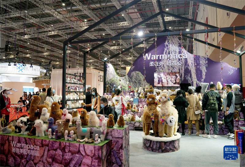 第四屆中國(guó)國(guó)際進(jìn)口博覽會(huì)消費(fèi)品展區(qū)的秘魯羊駝毛玩偶展臺(tái)(2021年11月6日攝)。新華社記者 劉穎 攝