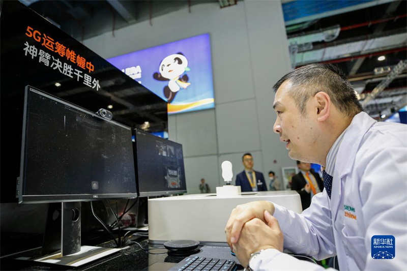 一位超聲科醫(yī)生在第二屆中國(guó)國(guó)際進(jìn)口博覽會(huì)上使用西門子5G醫(yī)療遠(yuǎn)程超聲解決方案,與重慶市彭水苗族土家族自治縣紹慶街道社區(qū)衛(wèi)生服務(wù)中心?的超聲醫(yī)生進(jìn)行遠(yuǎn)程實(shí)時(shí)高清超聲圖像傳輸和音視頻對(duì)話(2019年11月6日攝)。新華社記者 張玉薇 攝