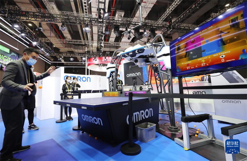 在第三屆中國(guó)國(guó)際進(jìn)口博覽會(huì)期間,一名男子體驗(yàn)與歐姆龍公司的一款乒乓球教練機(jī)器人對(duì)戰(zhàn),右側(cè)屏幕上實(shí)時(shí)顯示他的心率和情緒指數(shù)(2020年11月5日攝)。新華社記者 方喆 攝