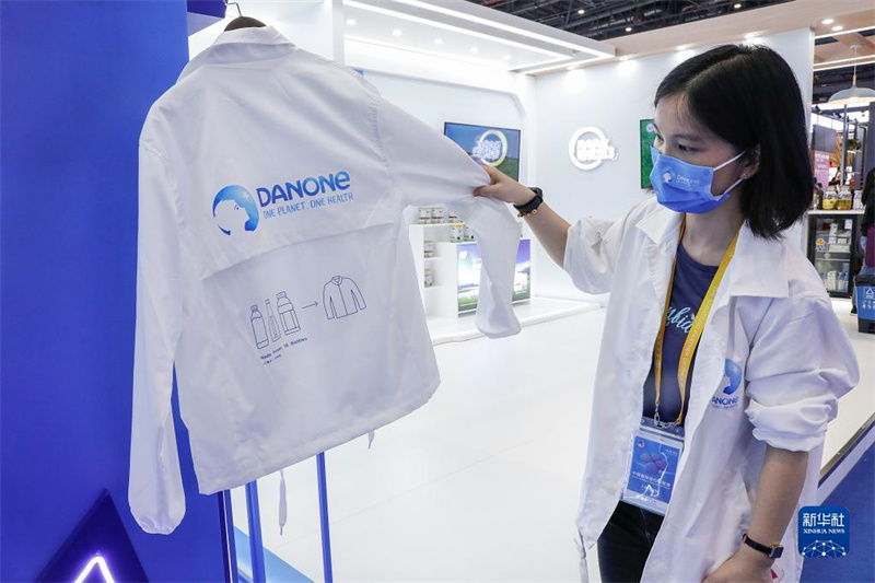 工作人員在第四屆中國(guó)國(guó)際進(jìn)口博覽會(huì)食品和農(nóng)產(chǎn)品展區(qū)達(dá)能展臺(tái)展示用塑料飲料空瓶制造的外套(2021年11月6日攝)。新華社記者 張玉薇 攝