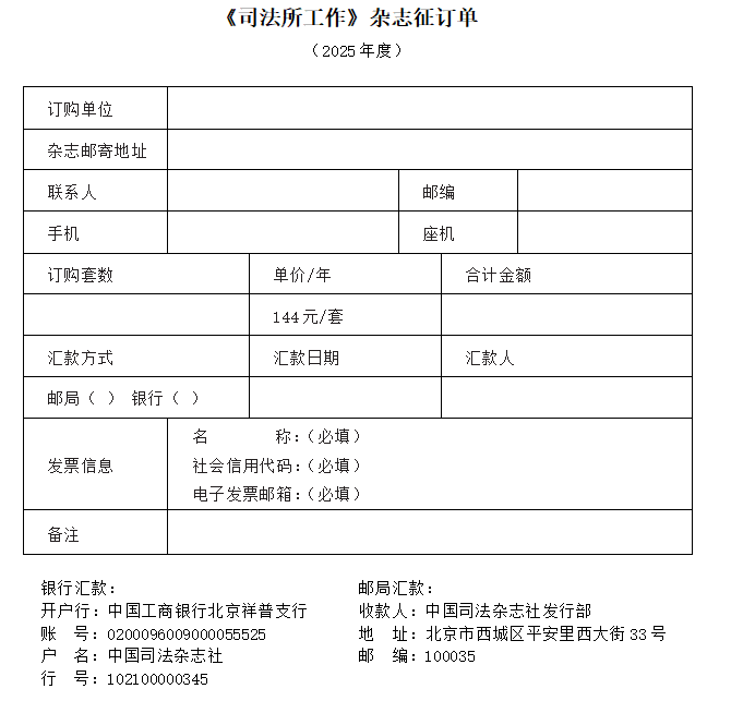 若不能進行在線提交訂單,請將本征訂單填寫完整后與匯款憑證一并發(fā)郵件至sfsgzfxb@moj.gov.cn或添加微信13681283507后發(fā)送電子版征訂單與匯款憑證。