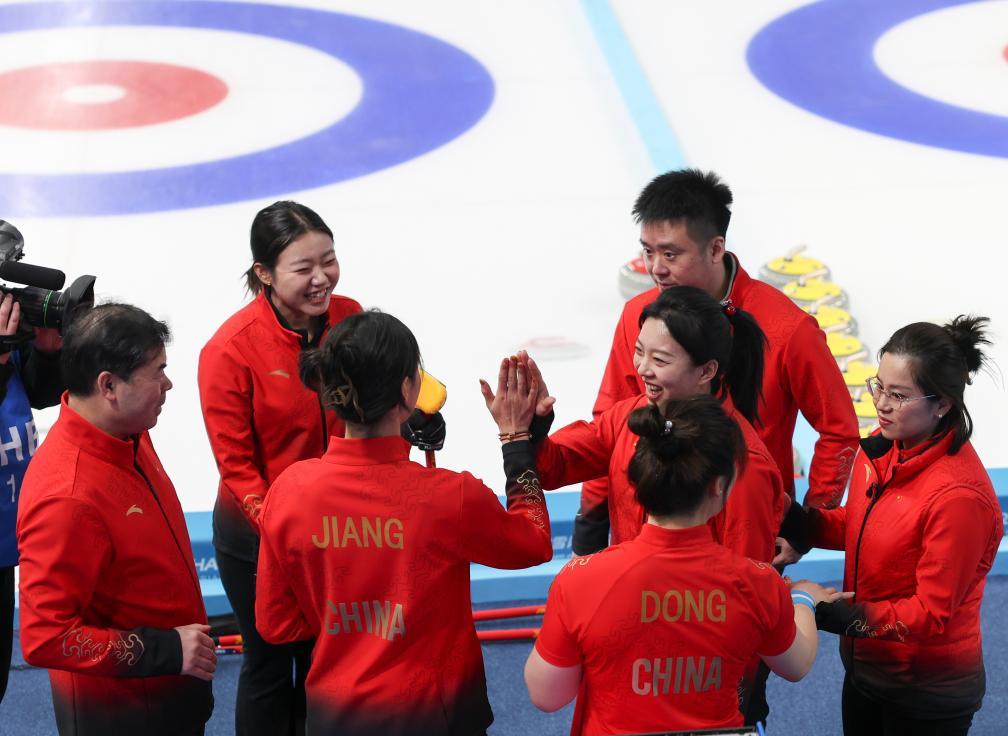 2月13日,中國(guó)冰壺隊(duì)教練和選手在比賽間隙相互鼓勵(lì)。新華社記者 胡星宇 攝
