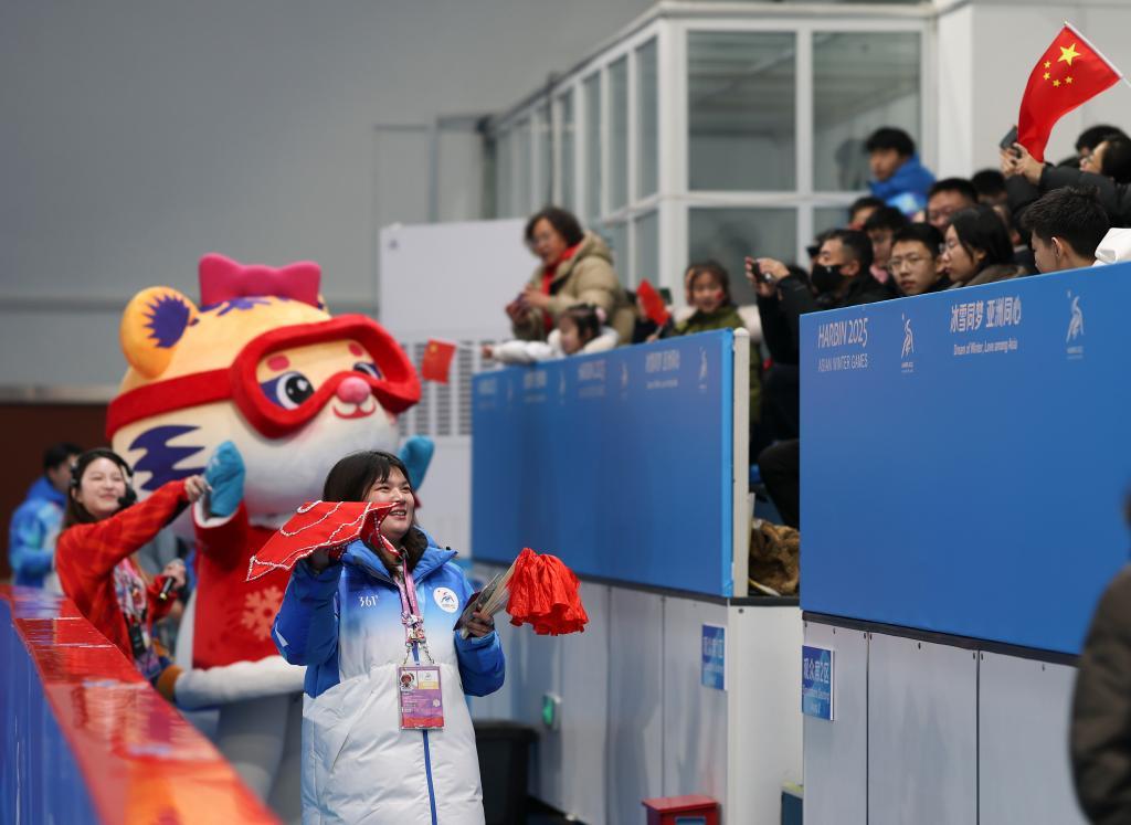 2月11日,志愿者和吉祥物“妮妮”在比賽前與觀眾互動(dòng)。新華社記者 胡星宇 攝