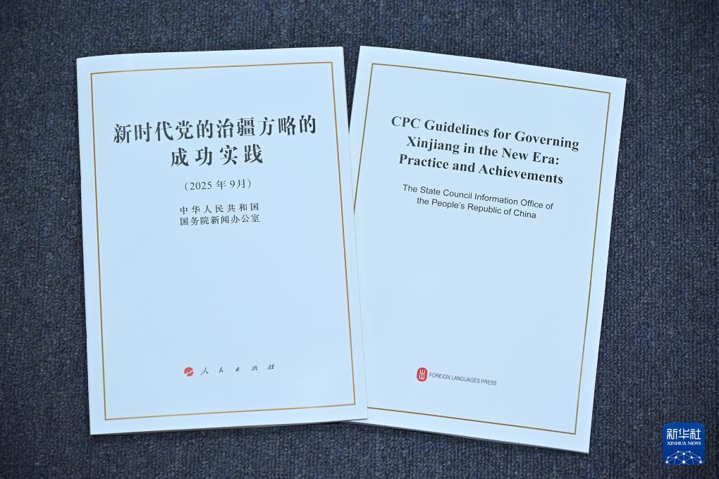 9月19日,國務院新聞辦公室在北京舉行新聞發(fā)布會,發(fā)布《新時代黨的治疆方略的成功實踐》白皮書,中央宣傳部副部長王綱,新疆維吾爾自治區(qū)黨委副書記、自治區(qū)主席艾爾肯·吐尼亞孜,新疆維吾爾自治區(qū)黨委常委、自治區(qū)常務副主席陳偉俊,新疆維吾爾自治區(qū)黨委常委、宣傳部部長王建新出席,介紹白皮書有關情況并答記者問。這是《新時代黨的治疆方略的成功實踐》白皮書。新華社記者 李鑫 攝