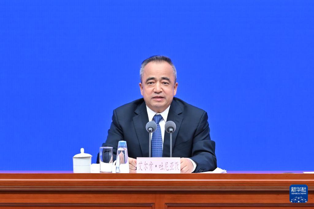 9月19日,國務院新聞辦公室在北京舉行新聞發(fā)布會,發(fā)布《新時代黨的治疆方略的成功實踐》白皮書,中央宣傳部副部長王綱,新疆維吾爾自治區(qū)黨委副書記、自治區(qū)主席艾爾肯·吐尼亞孜,新疆維吾爾自治區(qū)黨委常委、自治區(qū)常務副主席陳偉俊,新疆維吾爾自治區(qū)黨委常委、宣傳部部長王建新出席,介紹白皮書有關情況并答記者問。這是艾爾肯·吐尼亞孜在介紹情況。新華社記者 李鑫 攝