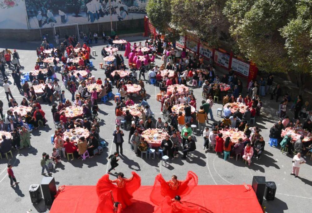 人們在烏魯木齊市天山區(qū)固原巷社區(qū)舉辦的活動(dòng)中品嘗百家宴,欣賞文藝演出。新華社記者 王菲 攝