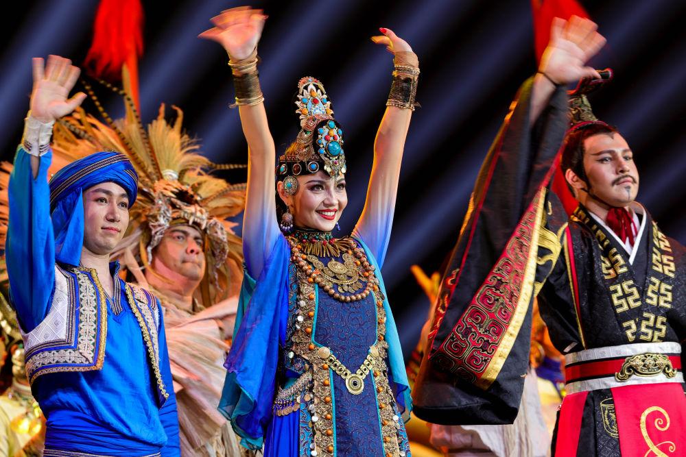 2022年4月22日,在新疆藝術(shù)劇院木卡姆藝術(shù)團劇場,舞蹈演員馬依熱·艾買提江(中)在舞劇《張騫》演出后向觀眾致謝。馬依熱來自烏魯木齊,11歲時前往北京跟隨專業(yè)舞蹈老師學習,學成后回到家鄉(xiāng),成為新疆藝術(shù)劇院歌舞團的一名舞蹈演員?!靶陆母栉枋侵腥A傳統(tǒng)文化的一部分,是用來歌頌美好生活的。希望我的舞蹈,能增進各民族間的感情,促進文化交融?!瘪R依熱說。
