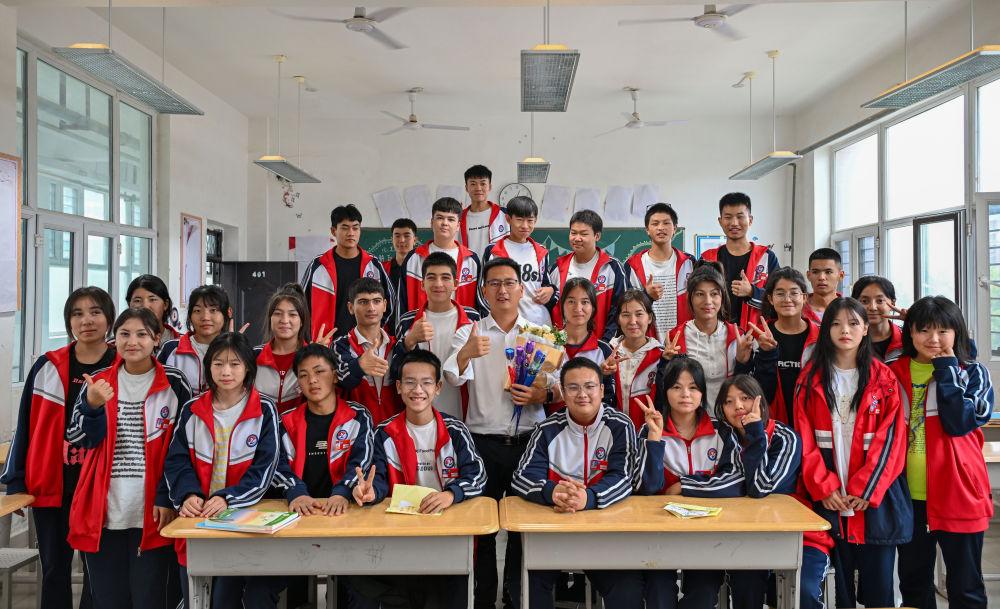 2024年9月10日,在新疆阿拉爾職業(yè)技術(shù)學校,援疆教師李斌傲(中)和23級電商班的學生合影?!?5后”年輕教師李斌傲是第十一批浙江臺州到新疆阿拉爾職業(yè)技術(shù)學校援疆教師中的一員,負責教授電子商務(wù)專業(yè)課程。他在學校主導籌建了電商實訓室,還帶了4個新入職的教師當徒弟?!芭嘤柡帽镜亟處?,就是打造一支帶不走的隊伍。”李斌傲說。