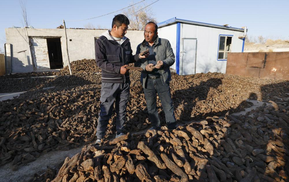 2024年12月4日,新疆民豐縣尼雅鎮(zhèn)甫甫克村村民麥麥提(右)同前來收購大蕓的商戶交流。自20世紀末新疆全面開展防風治沙工程并大力推進沙產(chǎn)業(yè)以來,麥麥提從在合作社挖大蕓賺工錢,到后來主動學習大蕓種植技術(shù)并創(chuàng)業(yè),一路走來小有收獲。2018年,他承包了10畝沙地種紅柳、大蕓。紅柳茁壯成長,大蕓產(chǎn)量頗豐,麥麥提年收入超過5萬元。