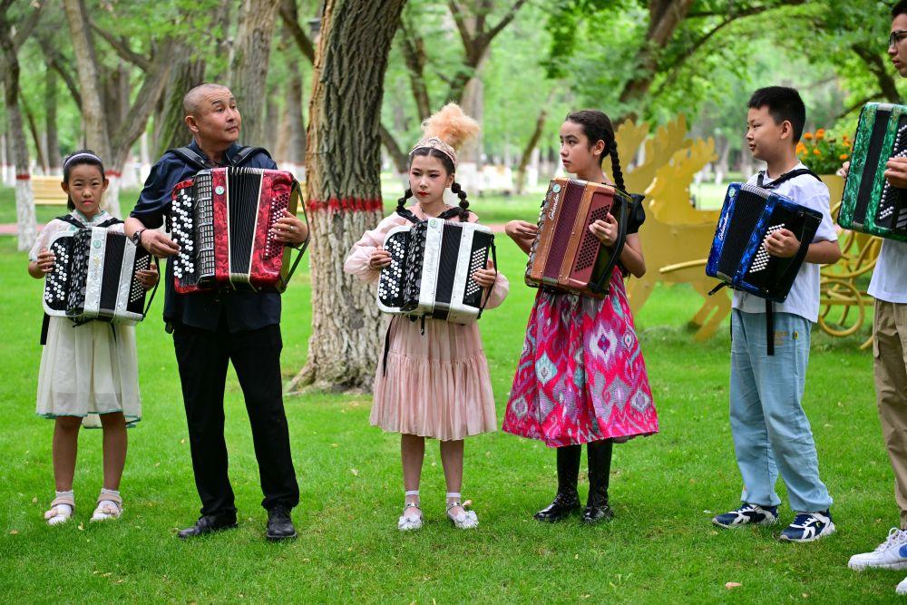 2024年7月24日,在新疆塔城市文化廣場,手風琴文化傳承中心老師道吾然·對山漢(左二)帶領(lǐng)學生練習手風琴。塔城市居住著漢族、哈薩克族、回族、維吾爾族、蒙古族、塔塔爾族、俄羅斯族等20多個民族,是一片多元文化沃土。手風琴是塔城市民間最廣為流傳的樂器,也是各族人民文化交流的重要媒介。近年來,塔城市深入挖掘手風琴文化,舉辦多場手風琴文化藝術(shù)節(jié)活動,為各民族文化交流提供平臺。