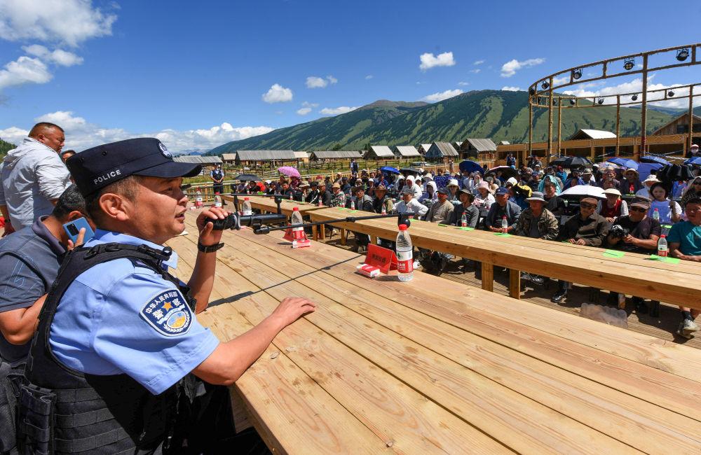 2024年7月22日,在新疆阿勒泰地區(qū)布爾津縣禾木哈納斯蒙古族鄉(xiāng)哈納斯村,喀納斯邊境派出所民警在村民大會上給村民宣講邊境法律法規(guī)。近年來,喀納斯邊境派出所通過“警村企黨支部聯(lián)合工作站”模式,聯(lián)合當?shù)厝罕?、景區(qū)一起解決游客難題,大大提升了警務(wù)效率,逐步形成了“景中警 貼心人”的旅游警務(wù)品牌。