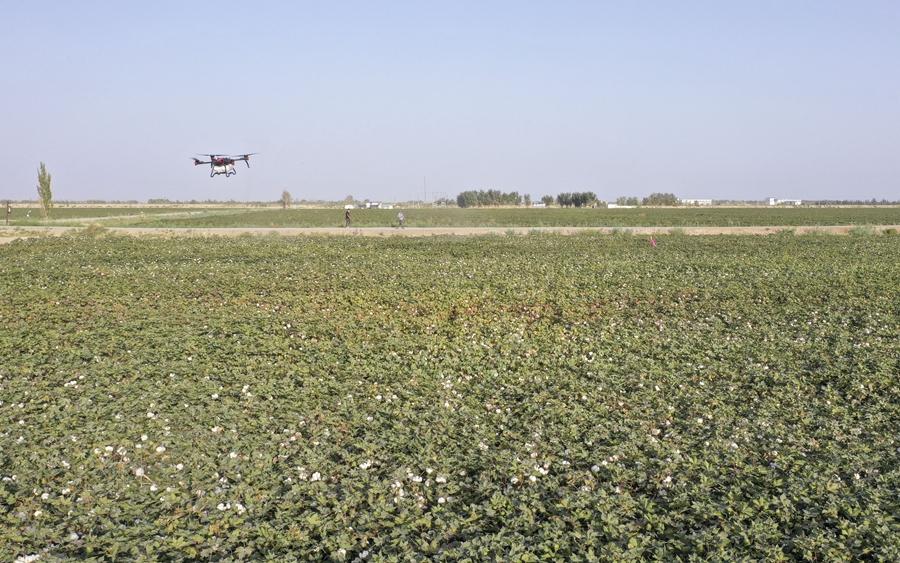 在新疆尉犁縣興平鎮(zhèn)達(dá)西村一處高標(biāo)準(zhǔn)農(nóng)田,種植戶用無人機噴灑脫葉劑(2022年9月20日攝,無人機照片)。新華社發(fā)(汪志鵬 攝)