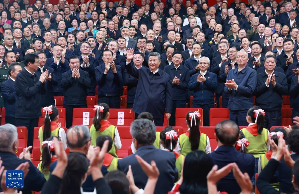 王滬寧、蔡奇、李干杰、何立峰、王小洪、雪克來提·扎克爾、諶貽琴、王東峰和劉振立,在新疆工作過的老同志,以及中央和國家機(jī)關(guān)有關(guān)部門負(fù)責(zé)同志、中央代表團(tuán)全體成員一同觀看演出。