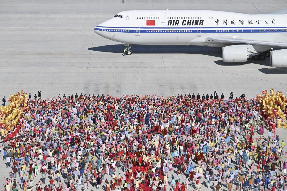 23日14時20分許,習近平總書記乘坐的專機在天山國際機場降落,等候在停機坪的新疆各族各界群眾熱烈歡呼。習近平總書記走出艙門,向歡迎群眾揮手致意。習近平總書記走下舷梯時,少先隊員獻上鮮花。
