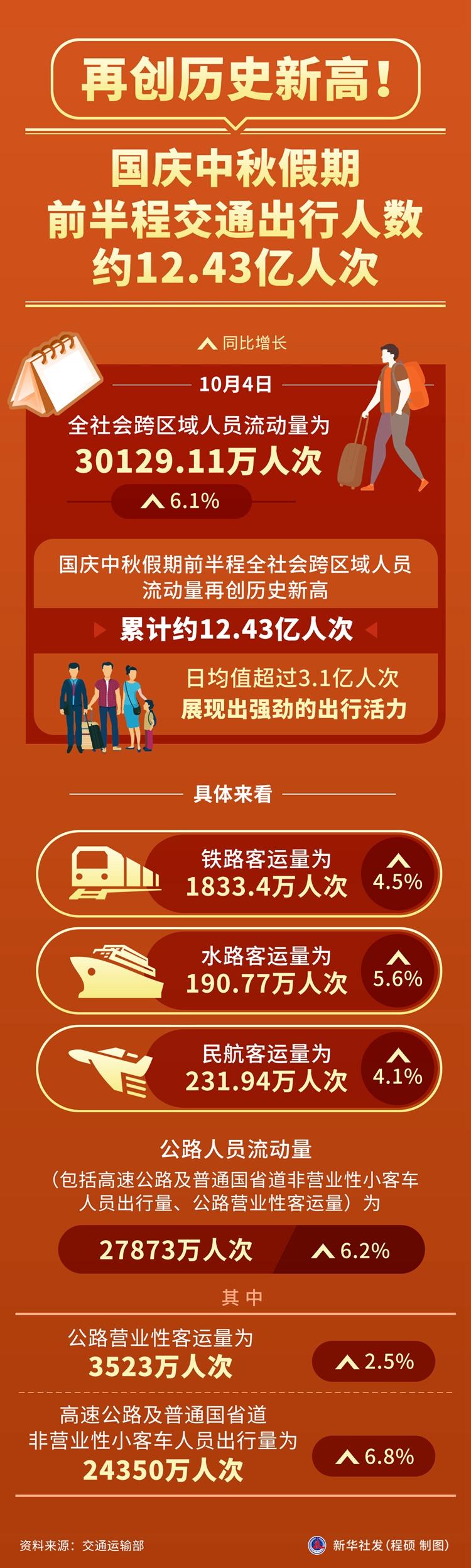 新華社北京10月5日電(記者葉昊鳴)記者5日從交通運(yùn)輸部獲悉,10月4日,全社會(huì)跨區(qū)域人員流動(dòng)量為30129.11萬人次,同比增長(zhǎng)6.1%。國慶中秋假期前半程全社會(huì)跨區(qū)域人員流動(dòng)量再創(chuàng)歷史新高,累計(jì)約12.43億人次,日均值超過3.1億人次,展現(xiàn)出強(qiáng)勁的出行活力。