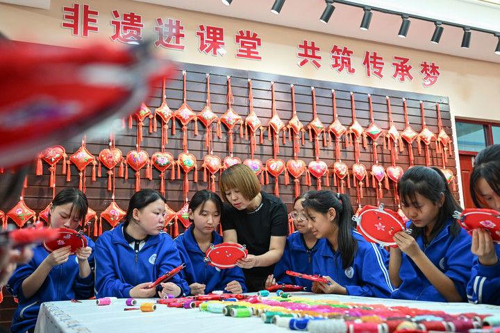 2025年9月26日,內(nèi)蒙古興安盟科右中旗巴彥呼舒第六中學(xué)美術(shù)教師、非遺代表性傳承人吳斯琴(左四)指導(dǎo)學(xué)生刺繡。近年來(lái),內(nèi)蒙古興安盟科爾沁右翼中旗巴彥呼舒第六中學(xué)將當(dāng)?shù)貒?guó)家級(jí)非遺圖什業(yè)圖刺繡引入校園,開(kāi)設(shè)校本課程,并成立興趣社團(tuán),在豐富校園文化生活的同時(shí),讓學(xué)生們近距離感受非遺的魅力,弘揚(yáng)和傳承中華優(yōu)秀傳統(tǒng)文化。