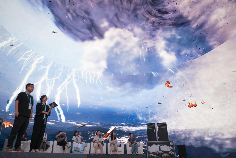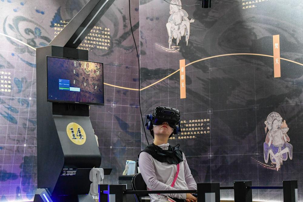 2024年7月22日,游客在“尋境敦煌——數(shù)字敦煌沉浸展”借助VR設(shè)備沉浸式游覽莫高窟第285窟虛擬場景。“尋境敦煌——數(shù)字敦煌沉浸展”綜合運(yùn)用VR虛擬現(xiàn)實(shí)、三維建模、游戲引擎的物理渲染和全局動態(tài)光照等新技術(shù),高精度立體還原了莫高窟第285窟。游客戴上VR眼鏡,不僅可以零距離觀賞壁畫、360度自由探索洞窟細(xì)節(jié),還能“飛升”到窟頂,身臨其境參與壁畫故事情節(jié),沉浸式感受敦煌文化的魅力。