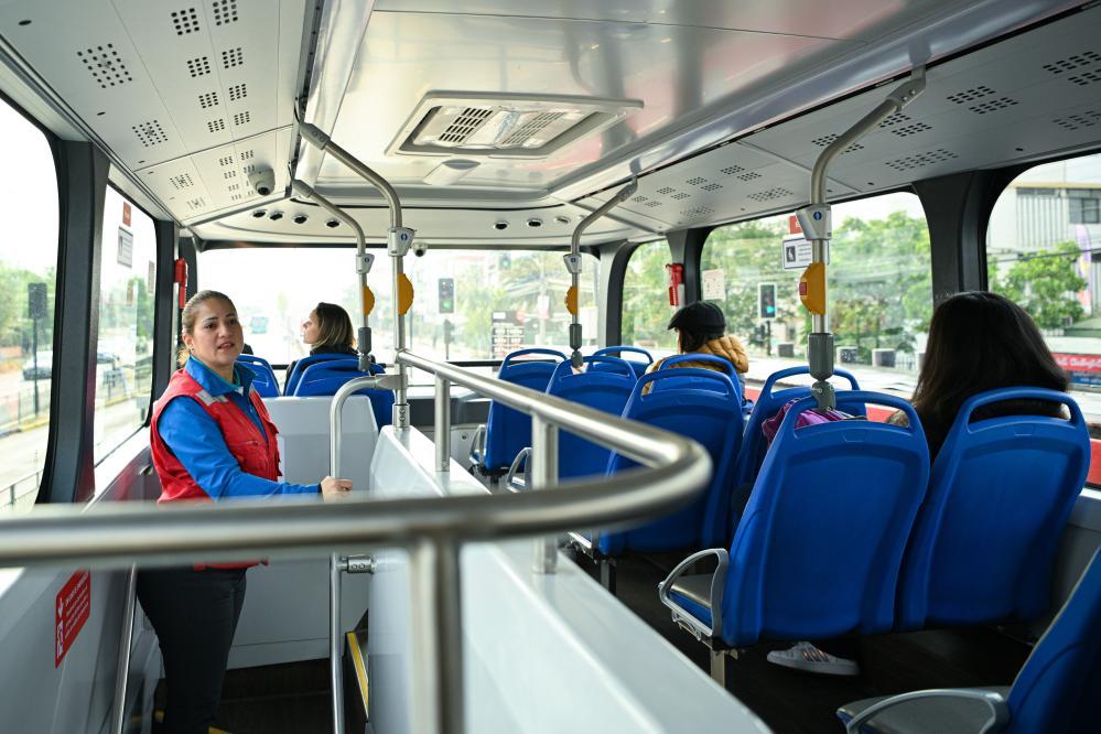 2023年11月2日,在智利首都圣地亞哥,一輛520路新能源公交車的工作人員在車內巡視。智利圣地亞哥520路公交路線是為2023泛美運動會特別開設的。新華社記者辛悅衛(wèi)攝