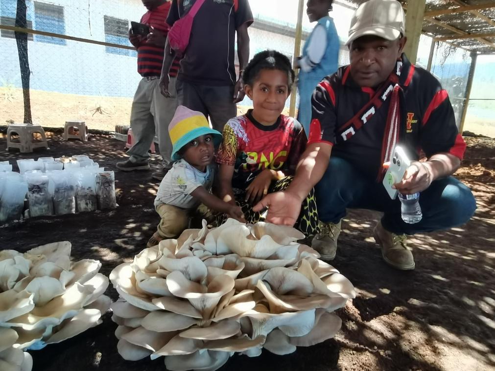9月29日,在巴布亞新幾內亞東高地省首府戈羅卡市,當地民眾參觀中國援巴布亞新幾內亞菌草旱稻項目永久性示范基地種植的大平菇。新華社發(fā)(福建農林大學國家菌草工程技術研究中心供圖)
