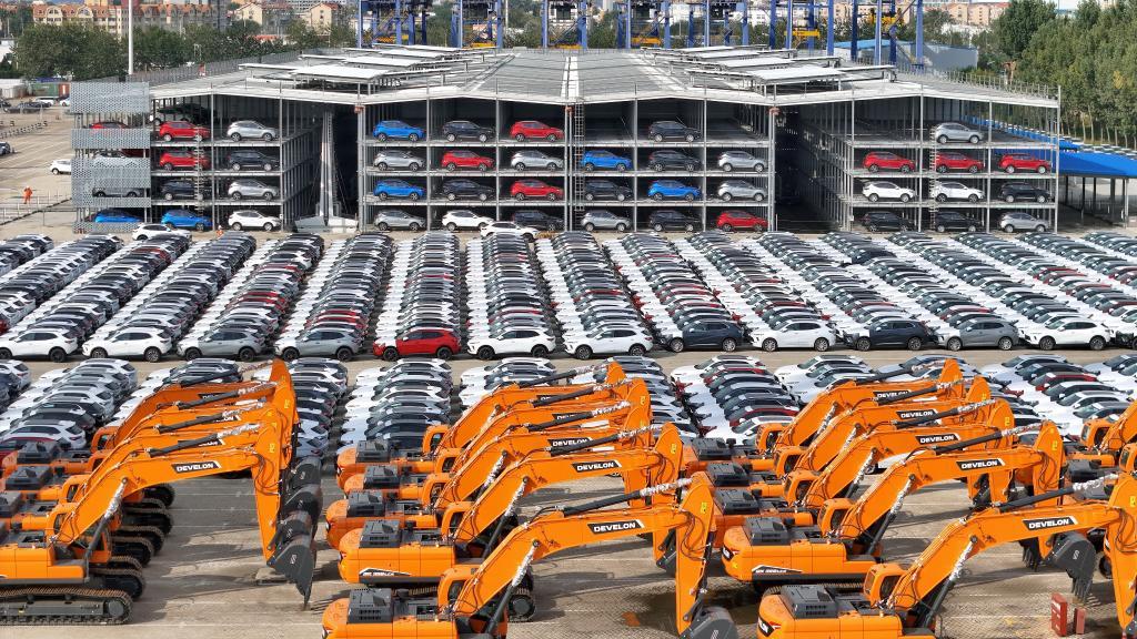 10月20日,國產汽車和工程機械在山東港口煙臺港集結等待裝船出口(無人機照片)。新華社發(fā)(唐克攝)