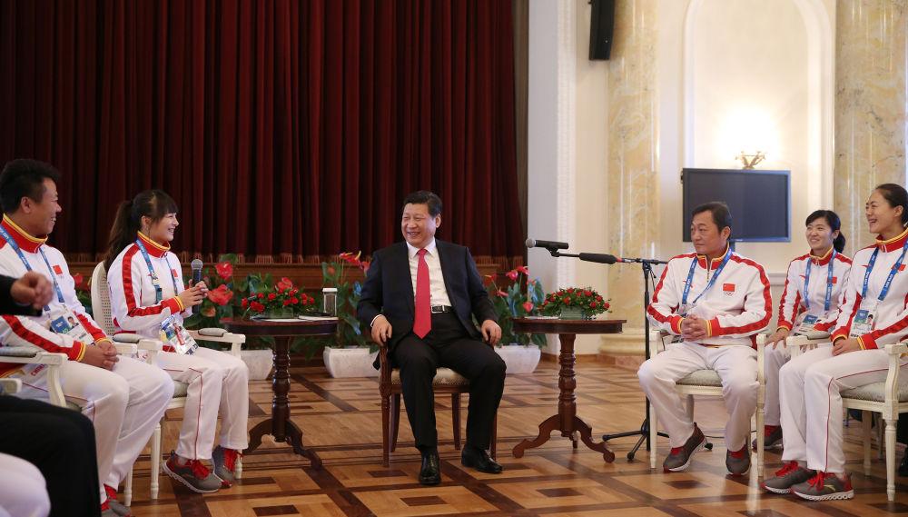 2014年2月7日,中共中央總書記、國(guó)家主席、中央軍委主席習(xí)近平在俄羅斯索契親切看望參加第二十二屆冬季奧林匹克運(yùn)動(dòng)會(huì)的中國(guó)體育代表團(tuán)。這是習(xí)近平在座談會(huì)上與代表團(tuán)成員親切交流。新華社記者 蘭紅光 攝