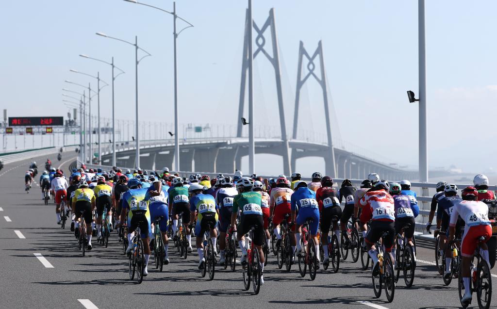 11月8日,參賽選手在港珠澳大橋騎行。當日進行的第十五屆全國運動會公路自行車男子個人賽,賽道全程231.8公里,選手經(jīng)過港珠澳大橋,跨越粵港澳三地。這是全運會歷史上首次舉辦跨境比賽。新華社記者 毛思倩 攝