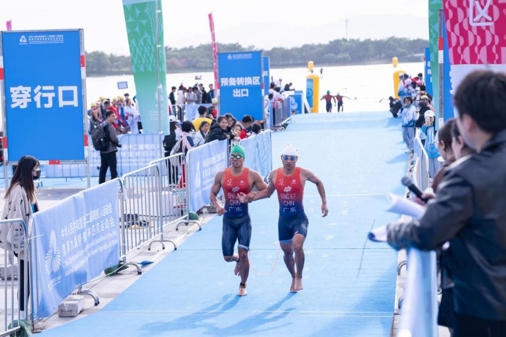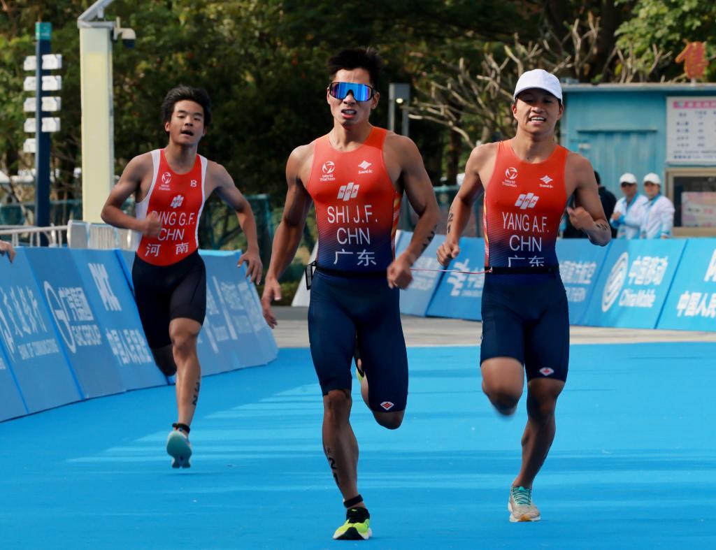↑11月27日,廣東一團選手石金飛(中)與引導員楊奧富在跑步比賽中沖刺