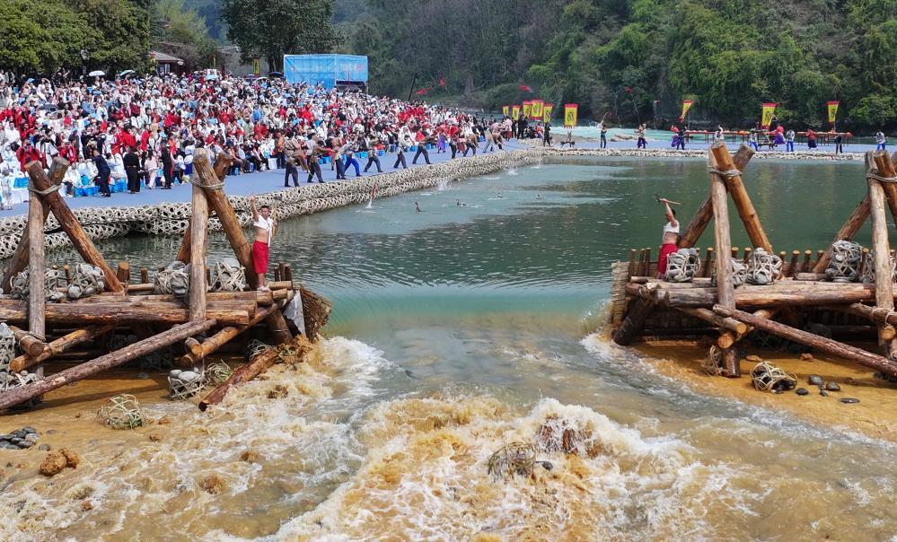 2025年4月4日都江堰放水節(jié),堰工砍斷榪槎的繩索后,岷江水奔流而下。新華社記者 江宏景 攝