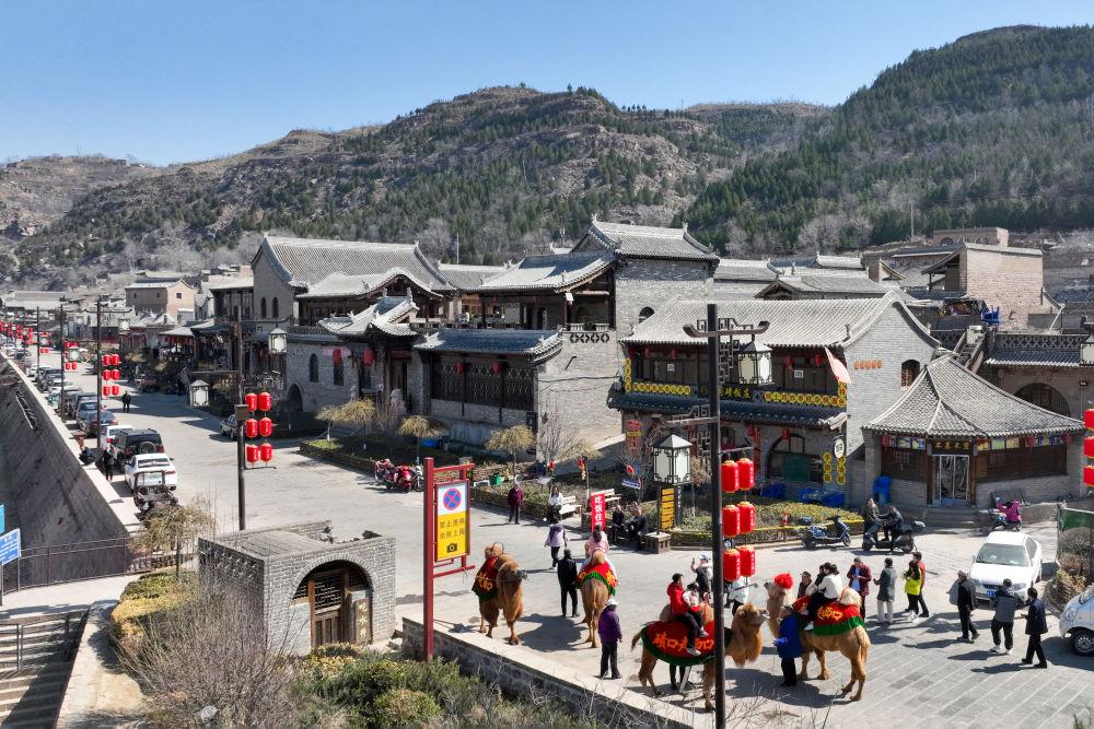 游客在山西省呂梁市臨縣磧口古鎮(zhèn)騎駱駝(2025年3月19日攝,無人機(jī)照片)。新華社記者 詹彥 攝