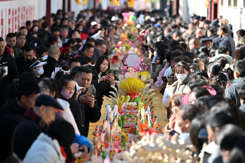 人們?cè)谏轿魇瘟菏袓箍h嵐城鎮(zhèn)欣賞面塑作品(2025年3月18日攝)。新華社記者 詹彥 攝