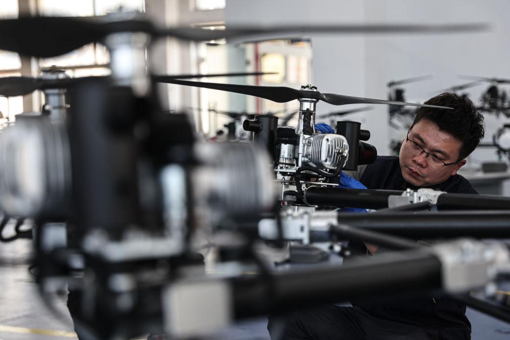 在遼寧省沈陽市沈北新區(qū)的優(yōu)選空天科工集團(tuán),工程師對(duì)一架待交付的應(yīng)急消防無人機(jī)進(jìn)行安全檢查(2025年4月25日攝)。新華社記者 潘昱龍 攝
