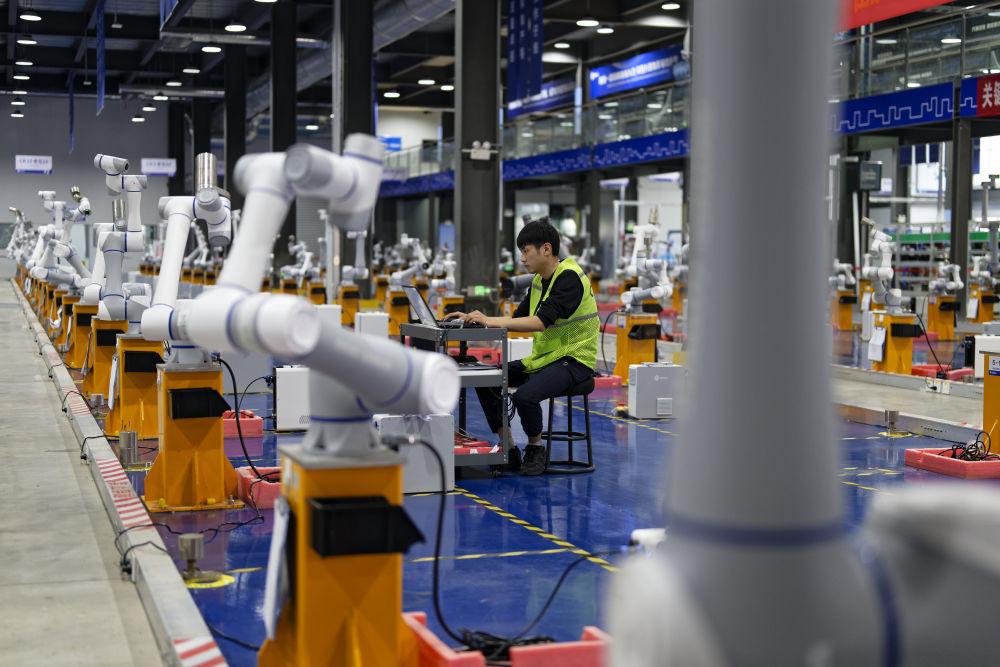 工作人員在山東省日照市經(jīng)濟(jì)技術(shù)開發(fā)區(qū)越疆機(jī)器人日照生產(chǎn)基地對(duì)機(jī)械臂產(chǎn)品進(jìn)行測(cè)試(2025年5月24日攝)。新華社記者 張笑宇 攝