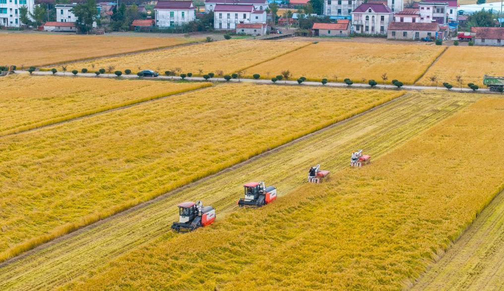 2025年10月30日,在江蘇省南通市通州區(qū)十總鎮(zhèn)育民村高標(biāo)準(zhǔn)農(nóng)田里,村民駕駛農(nóng)機收割水稻(無人機照片)。新華社發(fā)