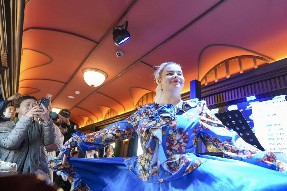 2025年12月6日,演員在黑龍江省“伊春號(hào)”旅游專列車廂中表演。當(dāng)日,“伊春號(hào)”旅游專列投入試運(yùn)行,40余名受邀體驗(yàn)的游客乘專列由哈爾濱站出發(fā),去往亞布力滑雪旅游度假區(qū)。2025年以來(lái),中國(guó)鐵路哈爾濱局集團(tuán)有限公司陸續(xù)開(kāi)行了多趟旅游列車,將特色體驗(yàn)、民俗展示、定制化服務(wù)等進(jìn)行融合,滿足游客需求,服務(wù)旅客出行。