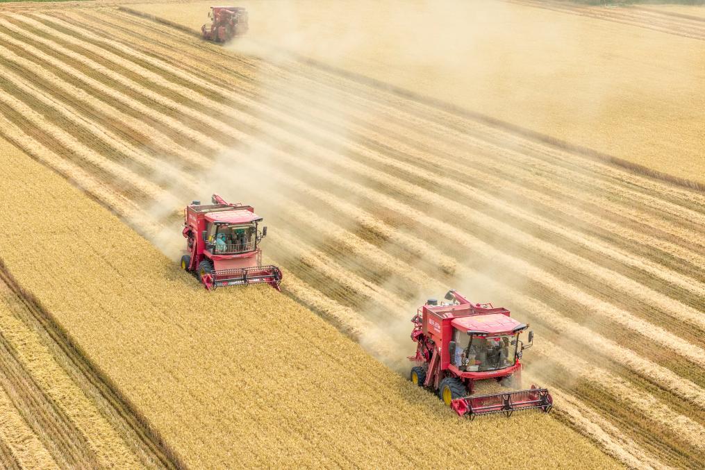 2025年6月9日,河南省三門峽靈寶市西閻鄉(xiāng)東古驛村村民在搶收小麥(無人機照片)。新華社發(fā)(杜杰攝)
