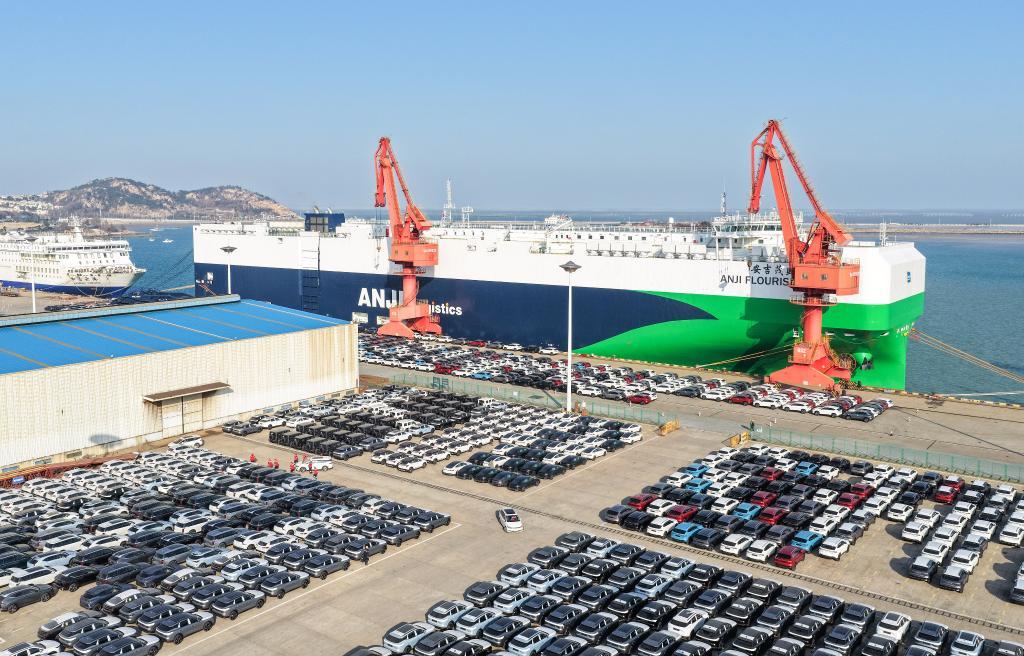 2025年12月17日,在江蘇連云港港,一艘滾裝船在裝運出口汽車(無人機照片)。新華社發(fā)(王健民攝)