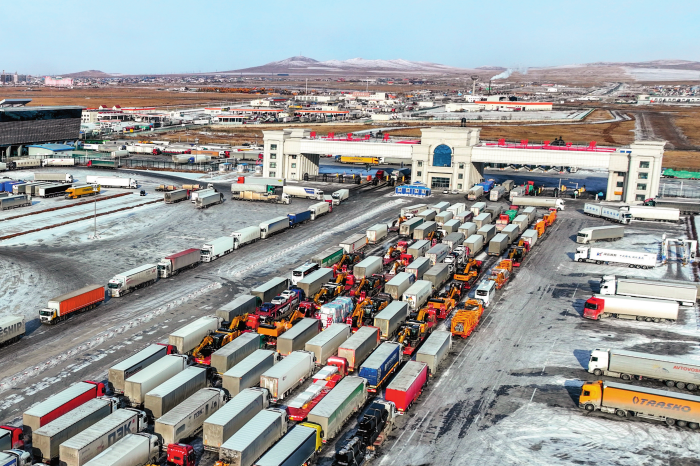 出入境貨車排隊通過滿洲里公路口岸(2025年12月3日攝)。新華社發(fā)(肖建波攝)